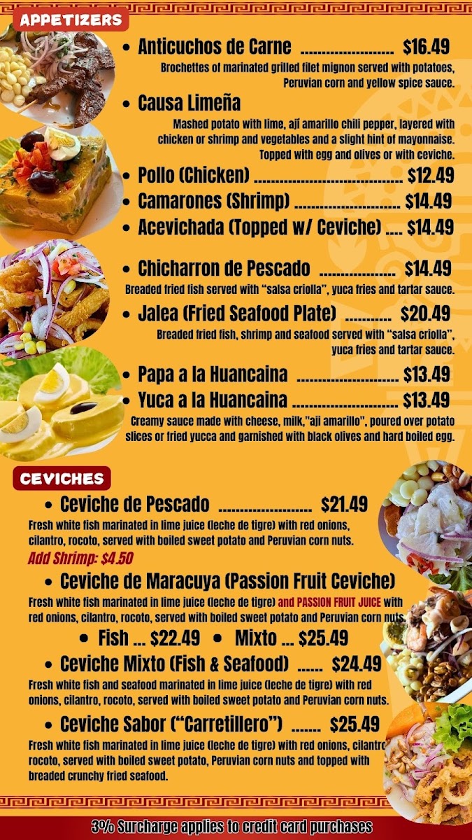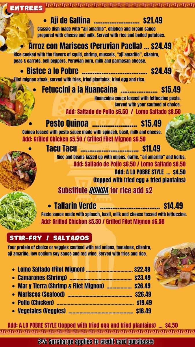 - Entrées: Savor the flavors of Arroz Con Mariscos, a delightful Peruvian paella, and the creamy Fettuccine A La Huancaina.